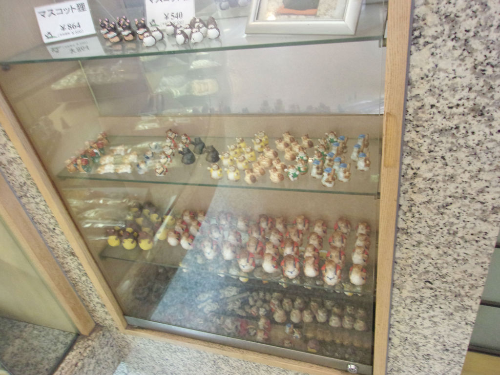 小さいマスコット狸は店頭で購入可能。上段の2種類だけで下3段は非売品です。