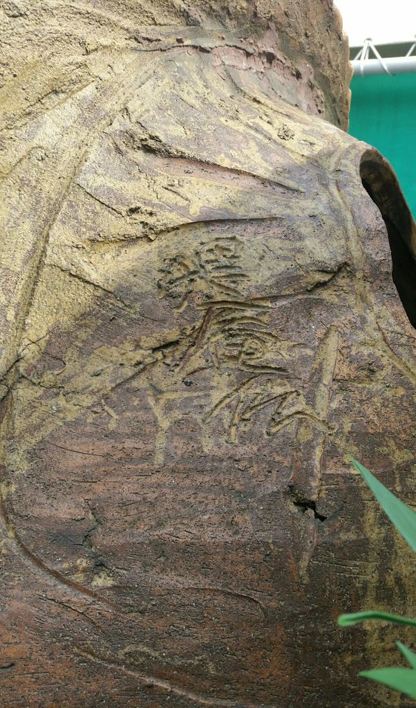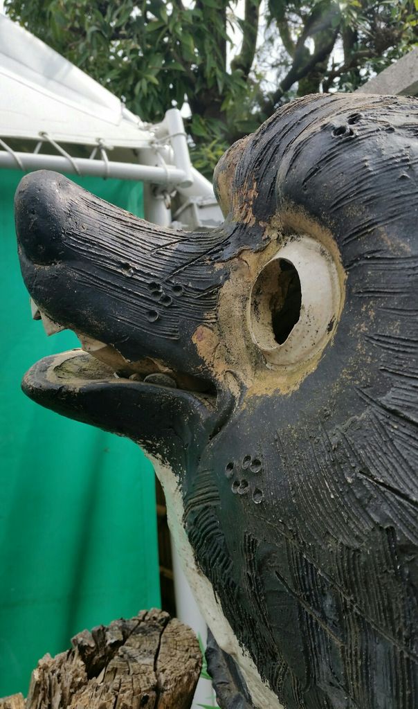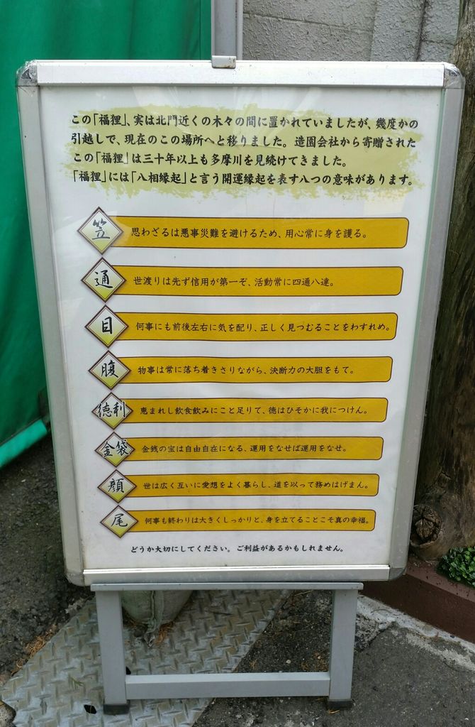 おなじみ八相縁起。この福狸さんは北門近くの木々の間に置かれていましたが、幾度かの引越で現地に来たそうです。造園会社さんからの寄贈で30年以上もこの地で多摩川を見続けてきました。狸センパイ
