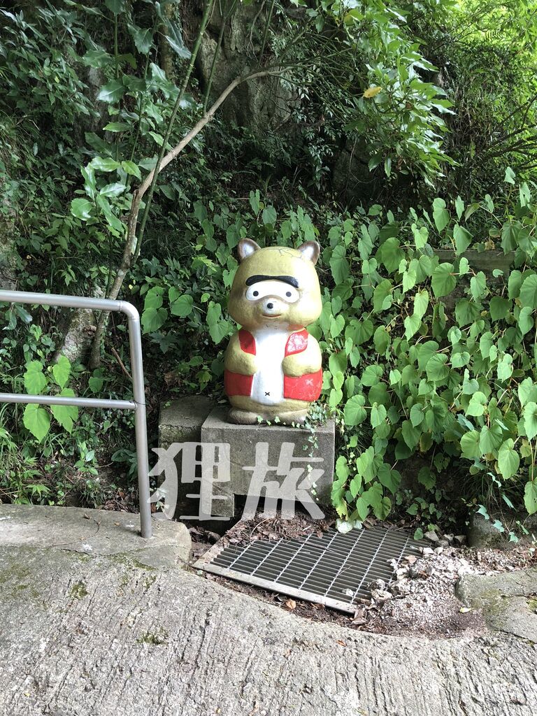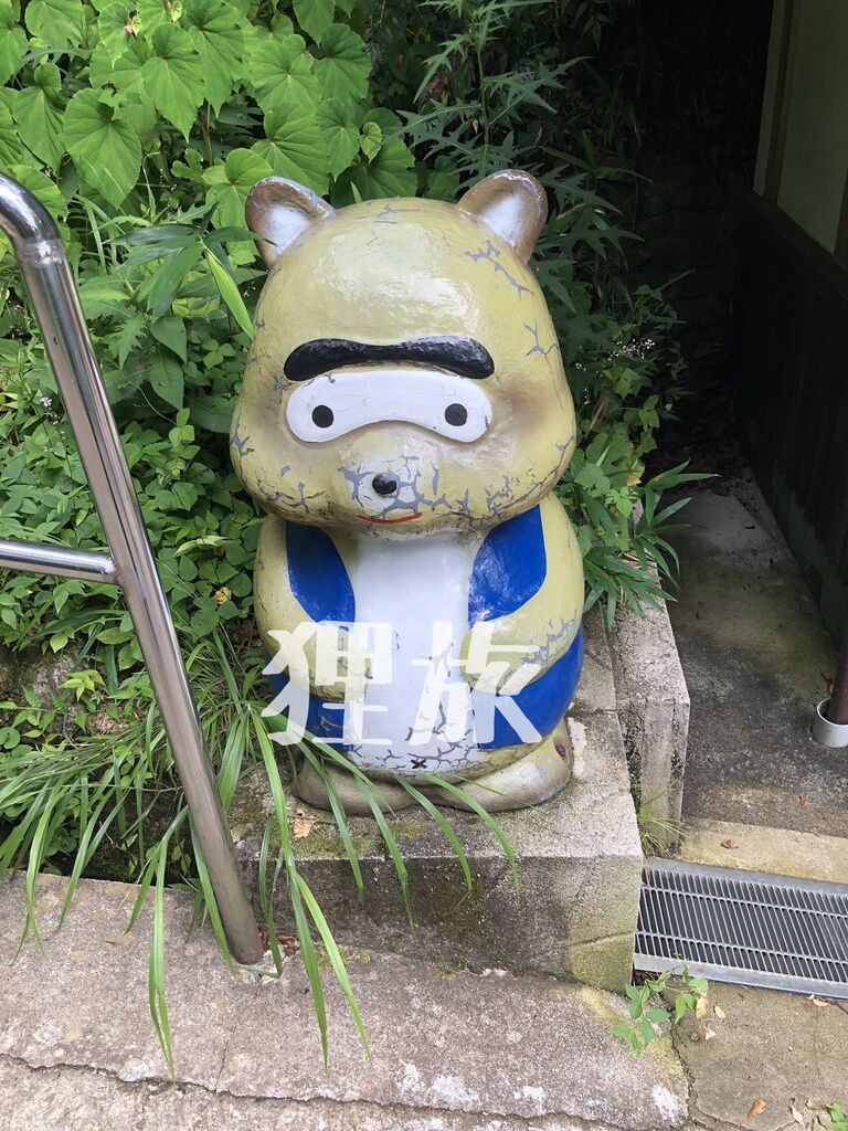 元々は「槇の穴」という地名に由来する名前で呼ばれていましたが、与謝野夫婦がその風光明媚な景観から「奇に満ちた洞」と詠んだことから、「満奇洞」という名前が付けられました。発券機の付近には狸を追っていたというエピソードに因んで、赤と青の法被を着た狸の像が2体設置されています。